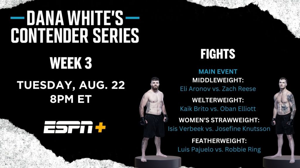 We are back with another preview for this season of the contender series! After back-to-back weeks where five victorious competitors all received contracts, bringing the total already this season to ten! We might be due for a drop-off in contracts this week. Last week I was three out of five on my fight-winning predictions bringing my total record for this season to 8-2. We have a four-fight event coming Tuesday. A fight was scrapped from our original five-fight card during Friday’s weigh-ins. The full event preview is listed below!
