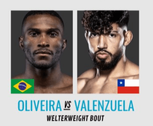 Michael Oliveira(8-0)(#35 WW Brazil)(-220 favorite) Vs Victor Valenzuela(12-3)(#28 WW North America)(+175 underdog)