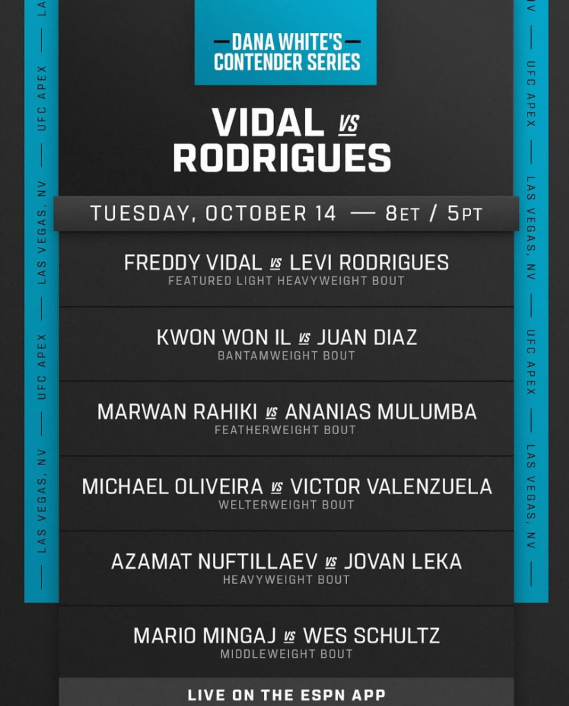Here we are, fight fans, after an eventful season 9 of the Contender Series. We have reached the final episode of the season, and what a season it has been so far! We had one of the greatest fights in the show’s history in last week’s co-main event. It was so epic that Dana went backstage right after the co-main event bout and gave both guys contracts, plus for the first time ever, 25K bonuses for both! We ended up with six new contracts out of the five fight winners and one fight loser, bringing the season total to 37 fighters who have been added to the roster. We went 4-1 on our straight card picks bringing the total to 52-22 on straight contender series picks dating back to the last two seasons. We have a special six-fight card for you this Tuesday to end the season so enjoy the last episode of season 9, A full event preview is below 👇🏻👇🏻